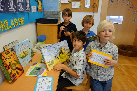Mit summenden, brummenden, fliegenden und krabbelnden kleinen Tieren beschäftigten sich die Kinder der 2a Klasse im Rahmen eines Insekten-Projektes. Lebensraum, Lebensweise, Körperbau, Mundwerkzeuge… dieser interessanten Tiergattung wurde anhand vielfältiger Materialien erforscht.